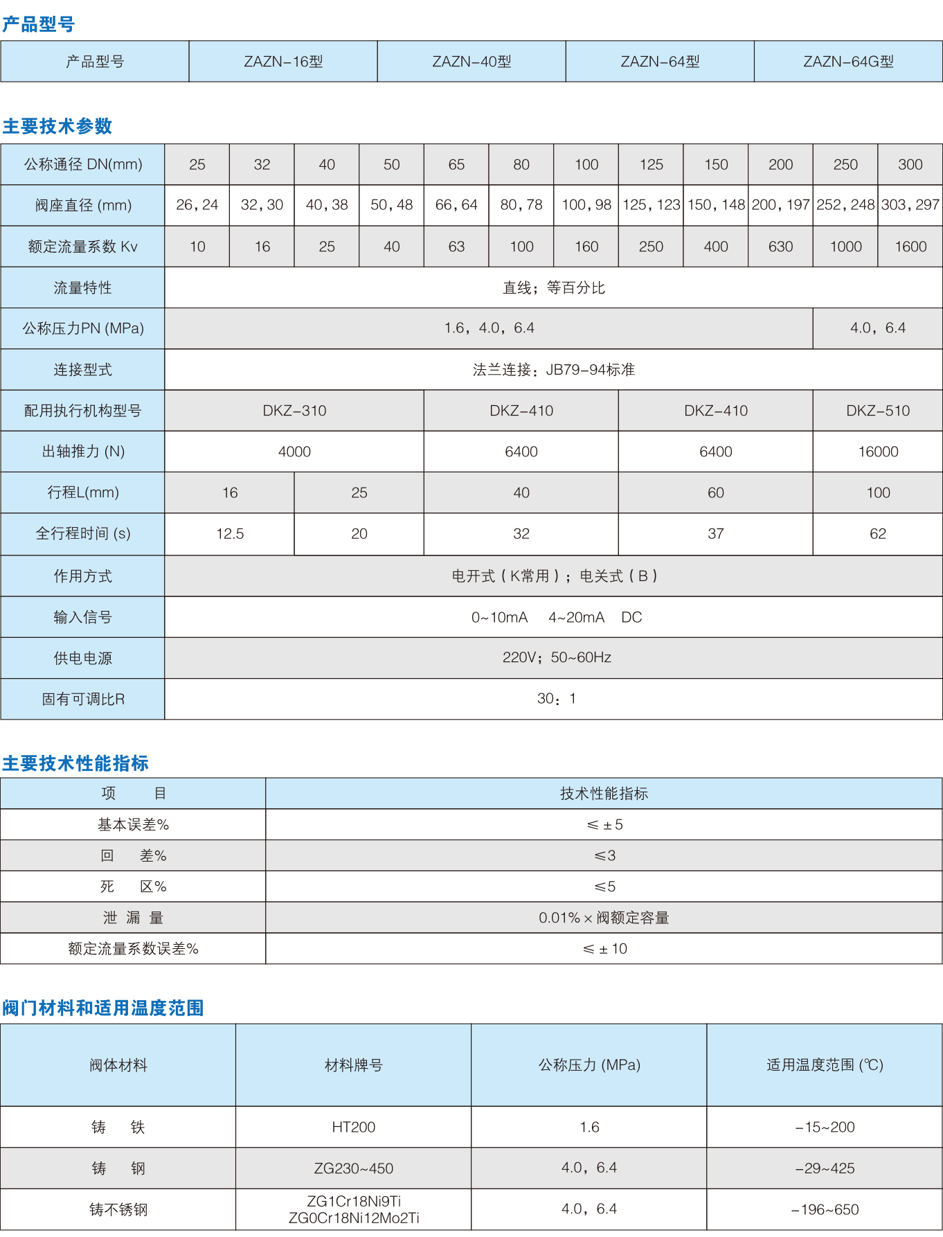 ZAZN系列电动直通双座调节阀由DDZ型系列直行程电动执行机构和直通双座阀两部分组成,以单相交流220V电源为动力,接受0~10mA或4~20mA直流信号,自动地控制调节阀开度,达到对管道内流体的压力、流量、液位等工艺参数的连续调节。