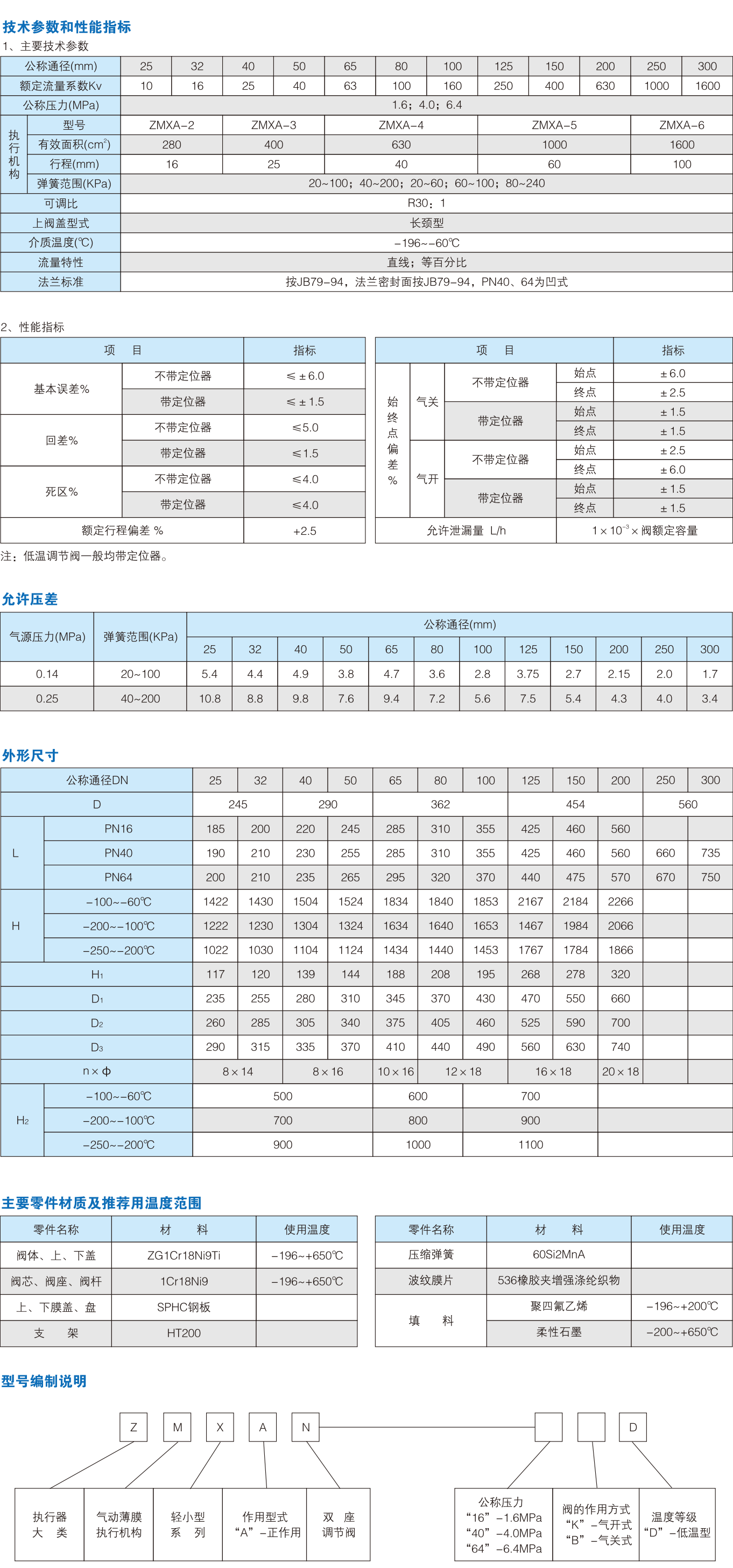 ZMXAN-D型轻小型气动薄膜低温双座调节阀是ZMAP-D的更新产品。由多弹簧可调零薄膜执行机构和长颈型低温双座调节阀组成,高度和重量比普通双座调节阀轻小。长颈型上阀盖可保证密封填料在允许温度范围内工作。适用于流量大、压差大,泄漏要求不严格的低温气体、液体等介质的调节控制。
