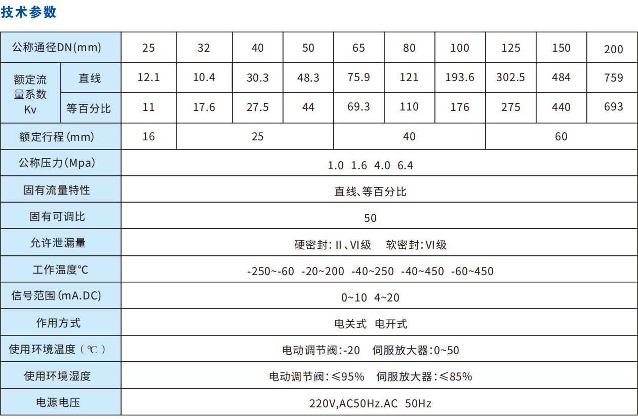 本系列产品公称通径由20至200mm,公称压力有1.0、1.6、4.0、6.4MPa,使用温度范围由-250℃~450℃,接受信号为0~10mA.DC或4~20mA.DC。电动双座调节调适用于压差较大场合。按阀内件密封部分材质分又有金属-金属和非金属-金属密封两种,后者阀关闭时泄漏量可达到Ⅵ级(零泄漏)标准。按填料不同可分为一般填料密封和波纹管密封两种,前者用于一般场合,而后者用于不允许外漏的特殊场合。流量特性为线性或等百分比。配用不同的执行机构可分为普通型和电子型两种。多种多样的品种规格可供选择。