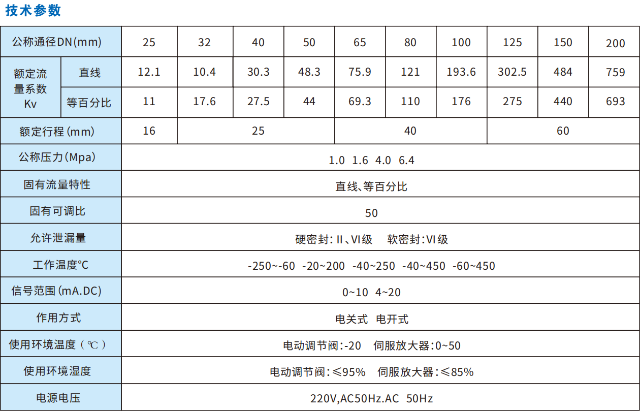 本系列产品公称通径由20至200mm,公称压力有1.0、1.6、4.0、6.4MPa,使用温度范围由-250℃~450℃,接受信号为0~10mA.DC或4~20mA.DC。电动双座调节调适用于压差较大场合。按阀内件密封部分材质分又有金属一金属和非金属—金属密封两种,后者阀关闭时泄漏量可达到Ⅵ级(零泄漏)标准。按填料不同可分为一般填料密封和波纹管密封两种,前者用于一般场合,而后者用于不允许外漏的特殊场合。流量特性为线性或等百分比。配用不同的执行机构可分为普通型和电子型两种。多种多样的品种规格可供选择。