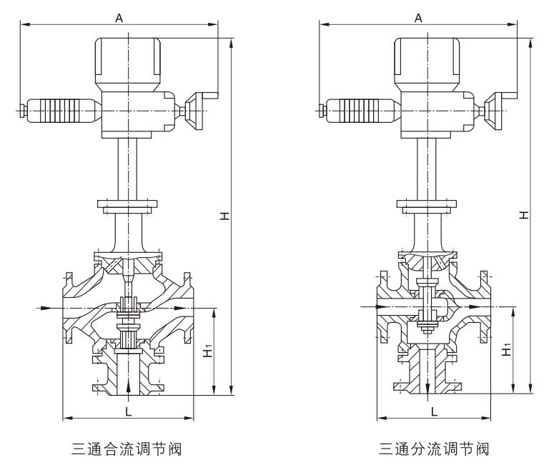ZAZQ(X)型电动三通合流(分流)调节阀有合流和分流二种形式,由DKZ电动执行机构和三通合流或三通分流调节阀组成,以电源为动力,接受统一的标准信号0~10mADC或4~20ADC驱使阀门开度与此操作信号相对应。合流阀的作用是将两种流体汇合成第三种流体,分流阀是将一种流体分成两路流体。分流合流阀只能对应选用,但当DN≤80时,合流阀可用于分流场合。可替代两台单、双座调节阀,节省投资,占据空间小。三通调节阀通常用于热交换器的两种介质调节及简单的配比调节。